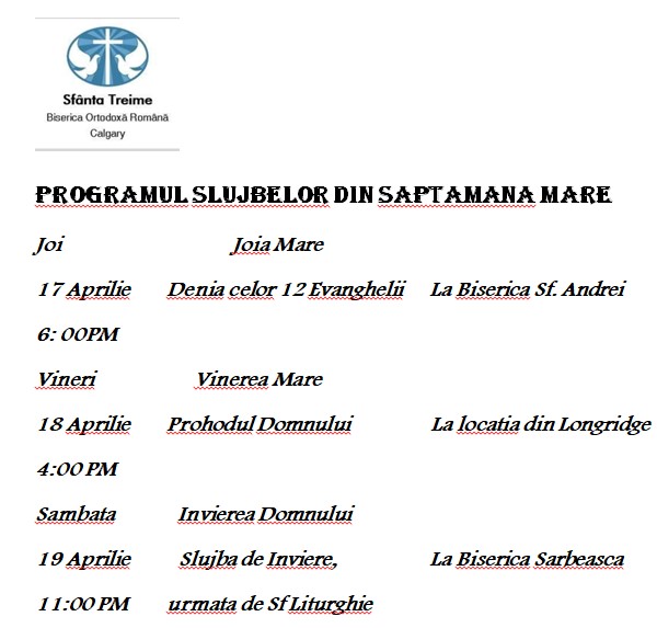 BISERICA SFANTA TREIME CALGARY Cum soarele cu lumina si caldura una sunt, la fel una sunt Tatal, Fiul si Duhul Sfant Donatii etransfer la sfantatreimecalgary@gmail.com Program Slujbe Duminica 10 AM-12AM Anunturi Programul Slujbelor din Saptamana Mare 2025 vorbeste cu noi Ai intrebari? Noi suntem todeauna deschishi sa vorbim cu tine despre problemele , proiectele si oportunitatile bisericii si cum putem sa te ajutam. Conecteaza-te
